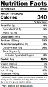 Isolat de protéine de pois, concentré de protéine de soya, farine de pois chiches, protéine de lentille, protéine de féverole, isolat de protéine de soya, poudre de haricot blanc (navy bean), poudre d’oignon, extrait de levure, poudre d’ail, sel.